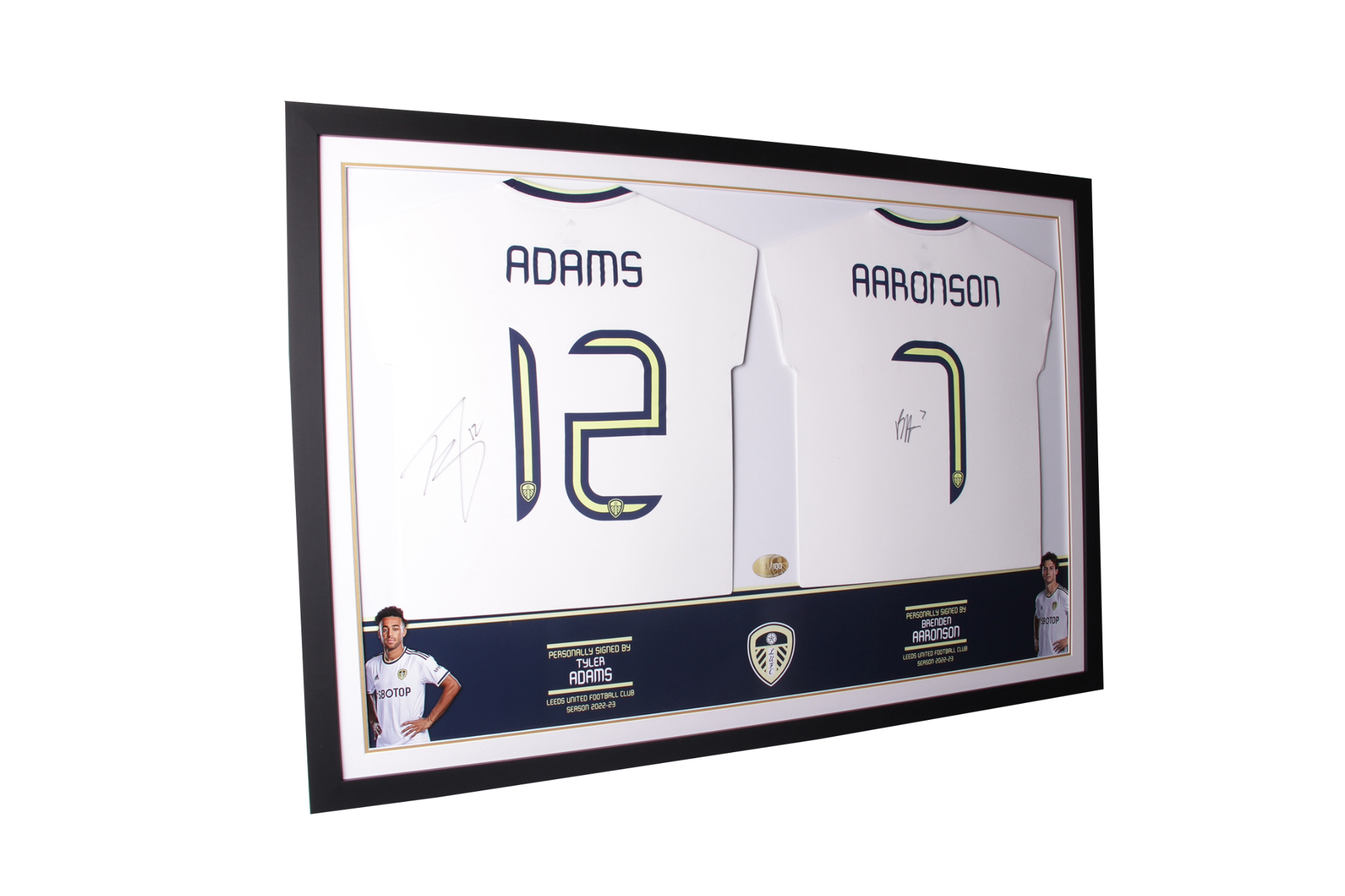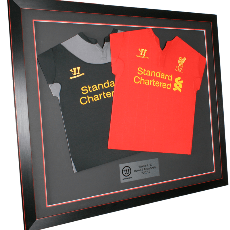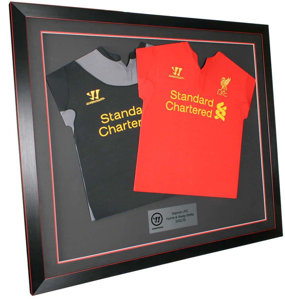 A great way to display two shirts together in one piece of wall art. The addition of photographic text boxes and images complete the piece. Various frame styles and mounts are available.